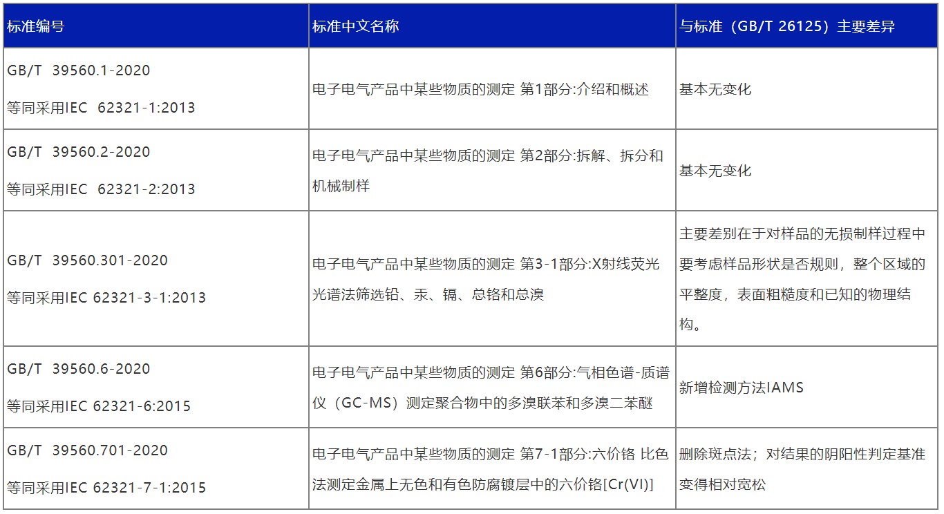 GB/T 39560系列標準相對于現行標準GB/T 26125-2011存在一些變化,如下為大家整理了新標準等同采用IEC 62321的情況以及與GB/T 26125-2011的差異,供企業參考。